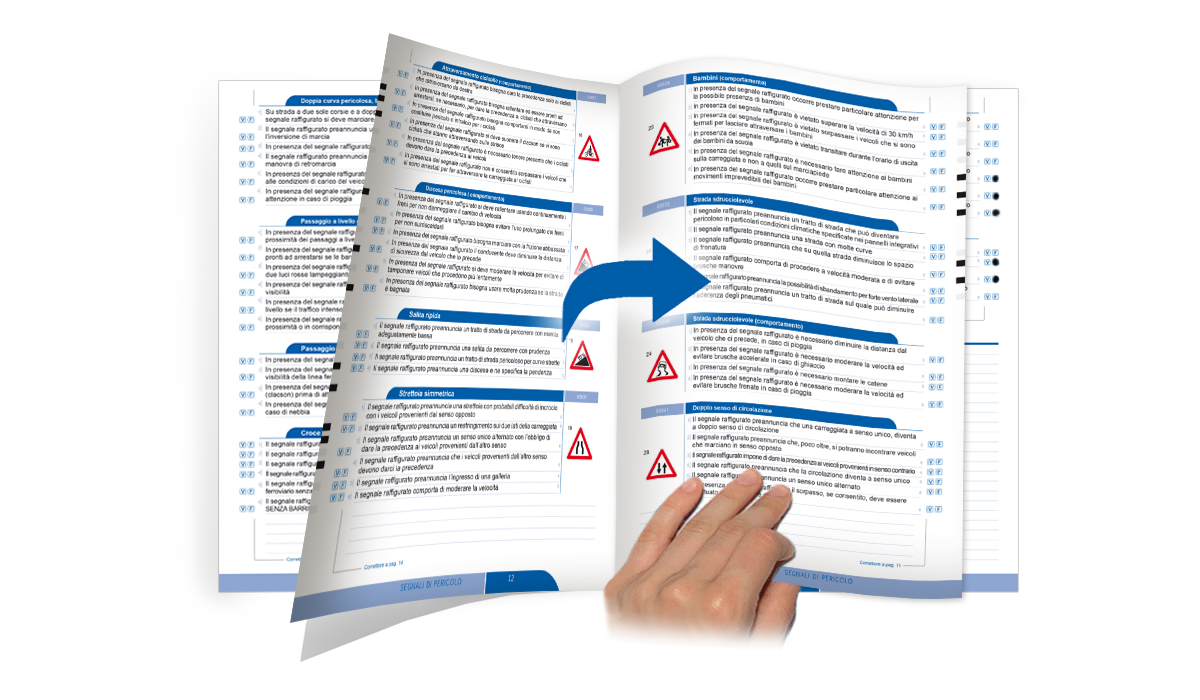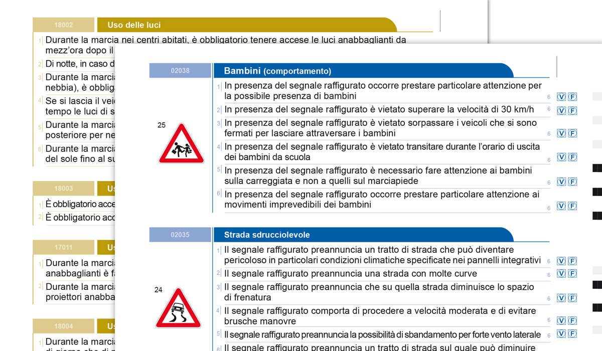 Il raggruppamento delle domande a "blocchi", con quiz che condividono come oggetto una norma o una nozione, si rivela utilissimo sia come prima verifica di quanto si è appena appreso in fase di studio sia per effettuare ripassi "mirati" in vista dell'esame presso la Motorizzazione.