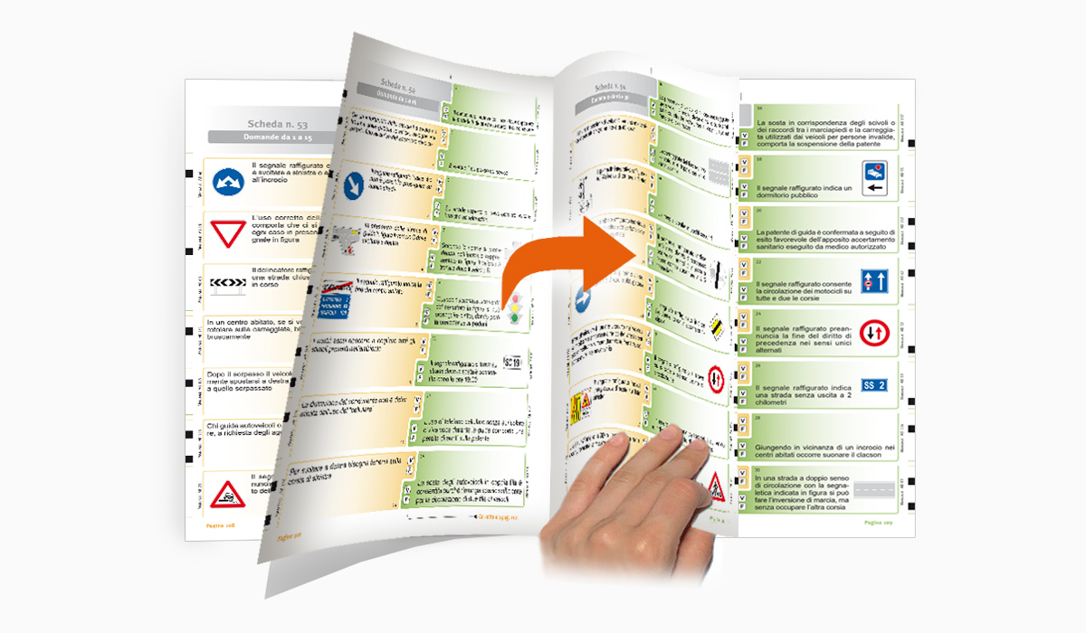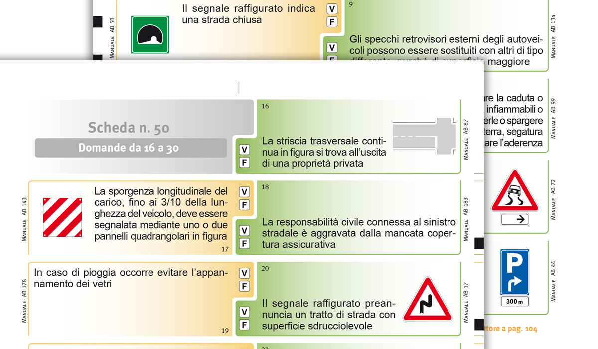 Il libro prevede 160 schede ciascuna composta da 30 domande. Le domande sono estratte dai 25 capitoli da cui è composto il database ministeriale. Per evitare inutili ripetizioni, vengono proposte 30 domande estratte dal database "bilanciate" in modo da svolgere tutti i quesiti nel minor numero di schede possibili.