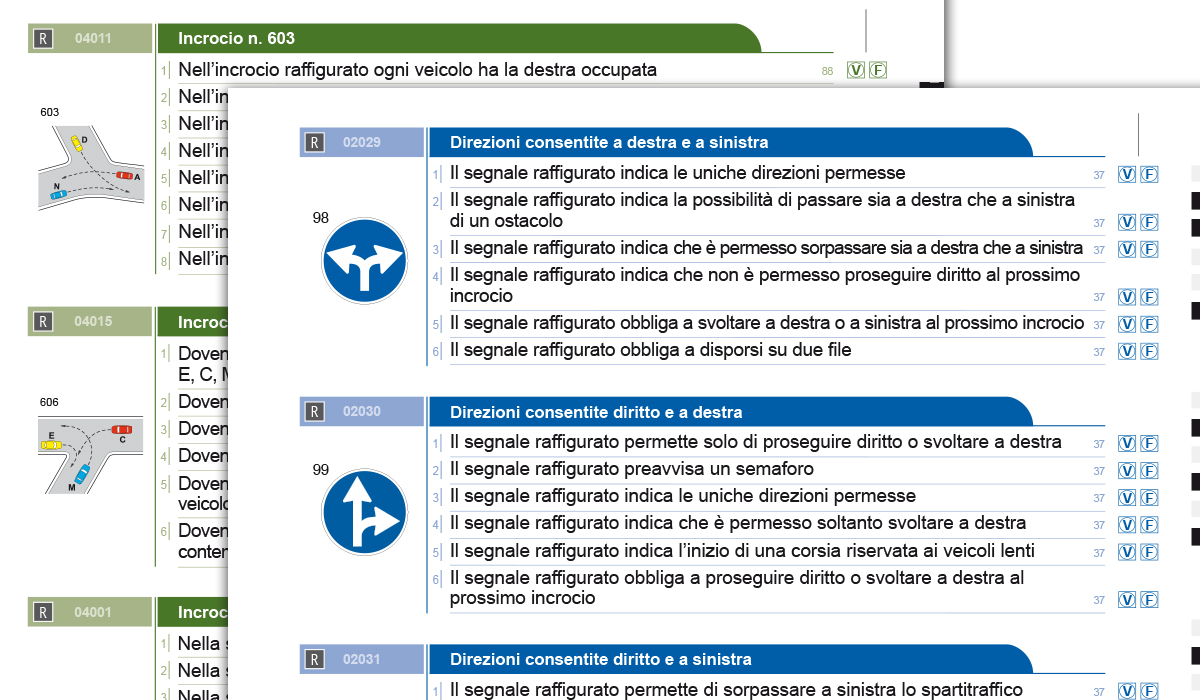 Il raggruppamento delle domande a "blocchi", con quiz che condividono come oggetto una norma o una nozione, si rivela utilissimo sia come prima verifica di quanto si è appena appreso in fase di studio sia per effettuare ripassi "mirati" in vista dell'esame presso la Motorizzazione.