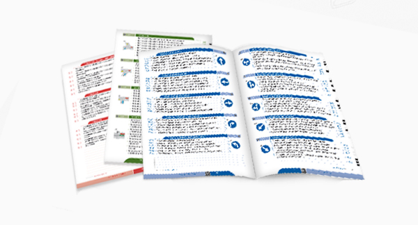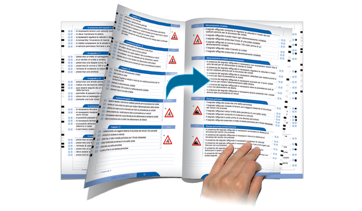 Sul bordo esterno pagina è riportato il correttore, rettangolini neri che rappresentano le risposte false. Terminati i quiz, per verificare il lavoro svolto si deve semplicemente voltare la pagina precedente o successiva e affiancare il correttore alla colonna delle risposte false.